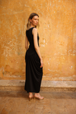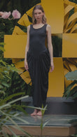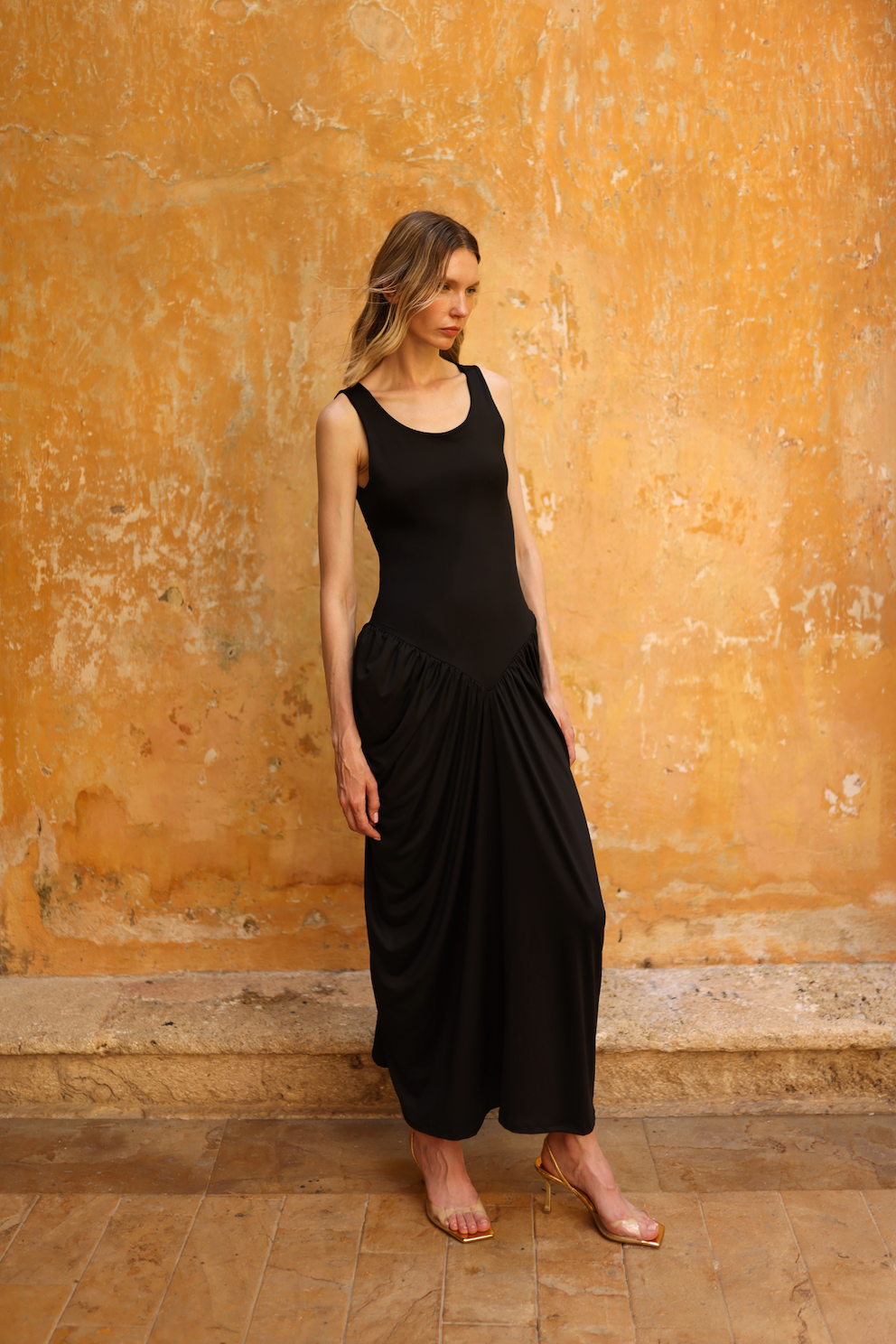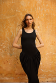 A modern, sculptural maxi dress designed with a sleek tank silhouette and dramatic gathered draping along the hips. Its clean neckline and body-skimming fit create effortless elegance, while the asymmetric ruching adds movement and visual interest. Minimal, refined, and striking.
