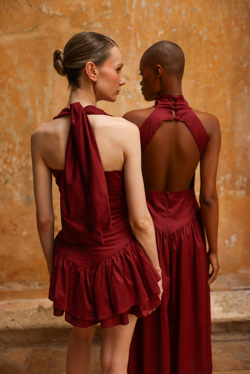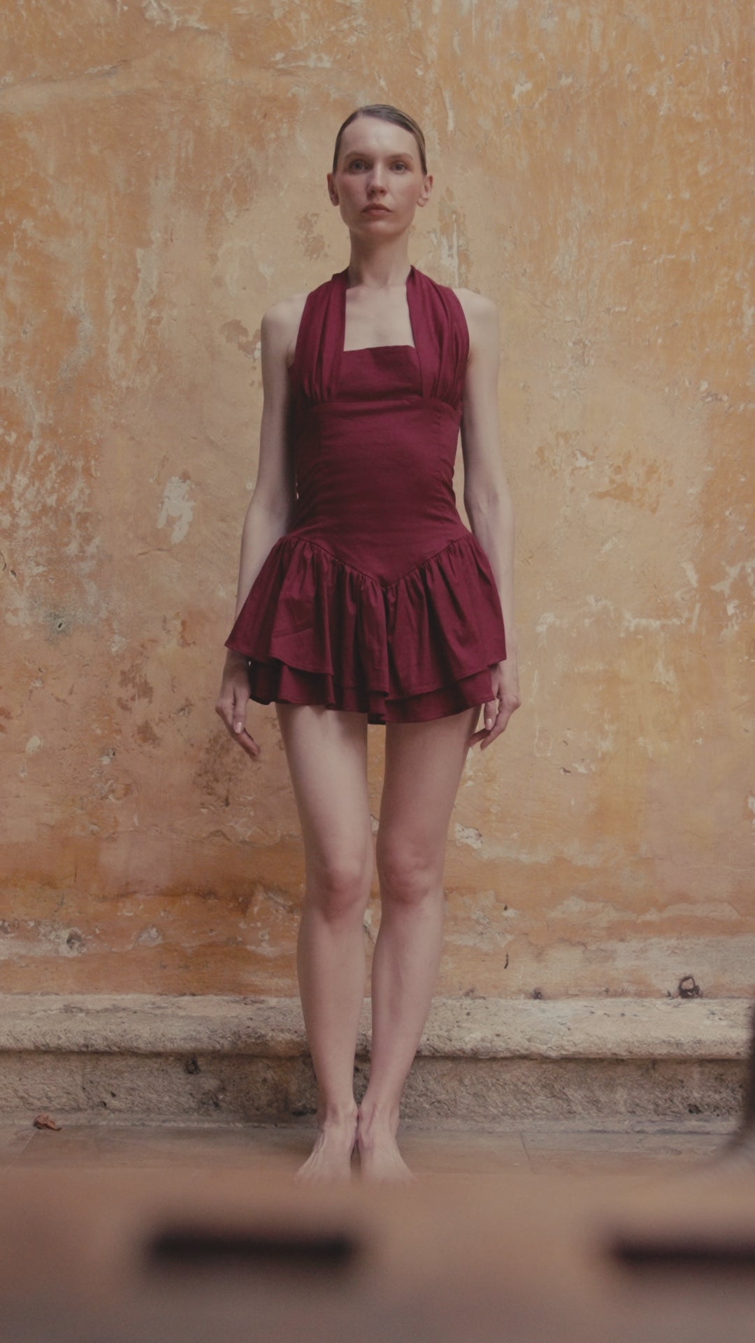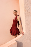 Playful yet refined mini dress designed to flatter and move with ease. Featuring a halter neckline, open back, and a structured bodice that defines the waist, it flows into a soft, tiered skirt for added volume and femininity.