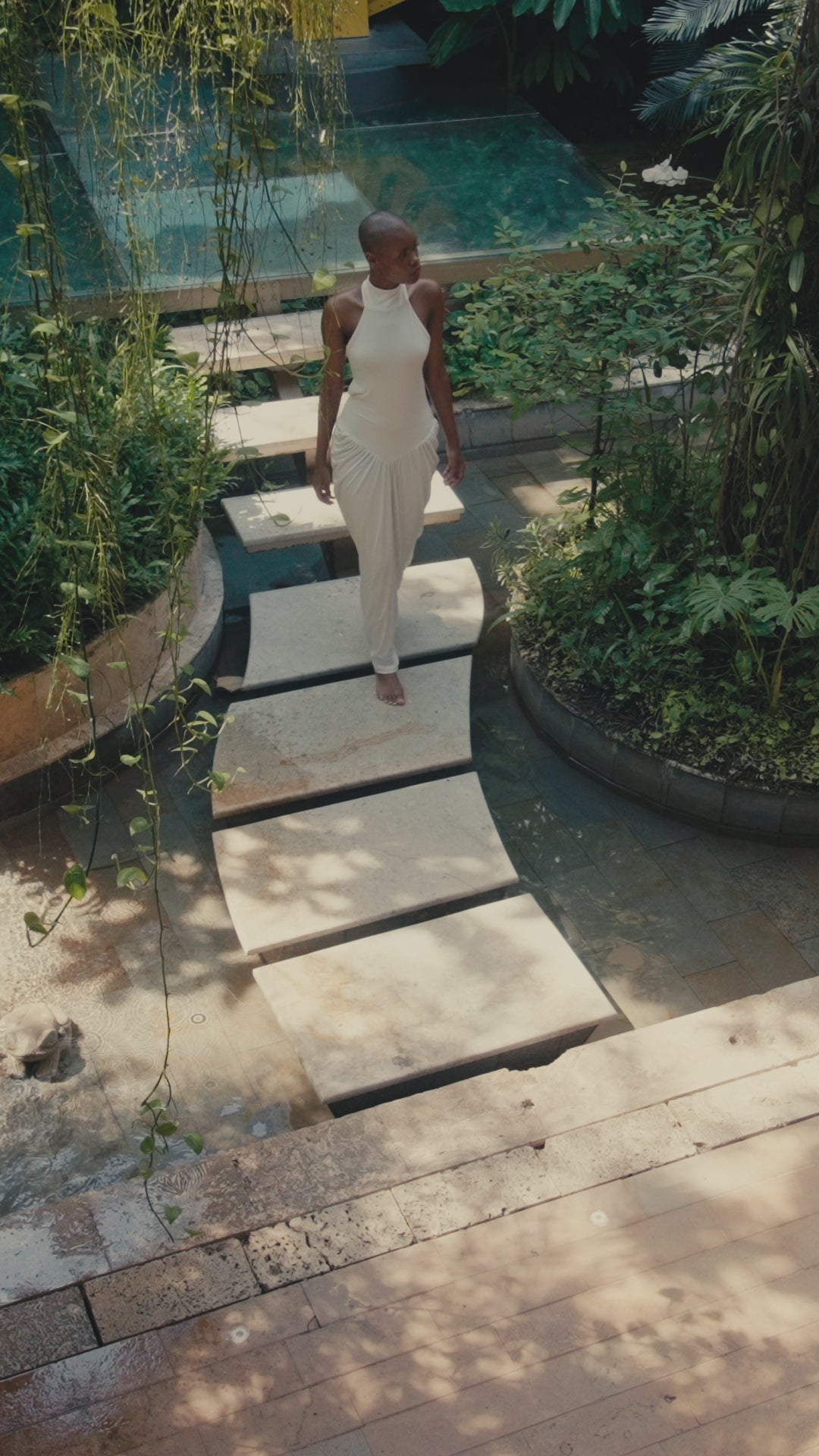 A striking halter-neck maxi dress designed with soft, sculptural draping that defines the waist and flows effortlessly into a long, elegant skirt. The open back adds a modern, sensual touch, creating a perfect balance between minimalism and movement. Light, refined, and timeless—this is the statement piece for elevated resort nights.
