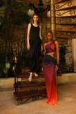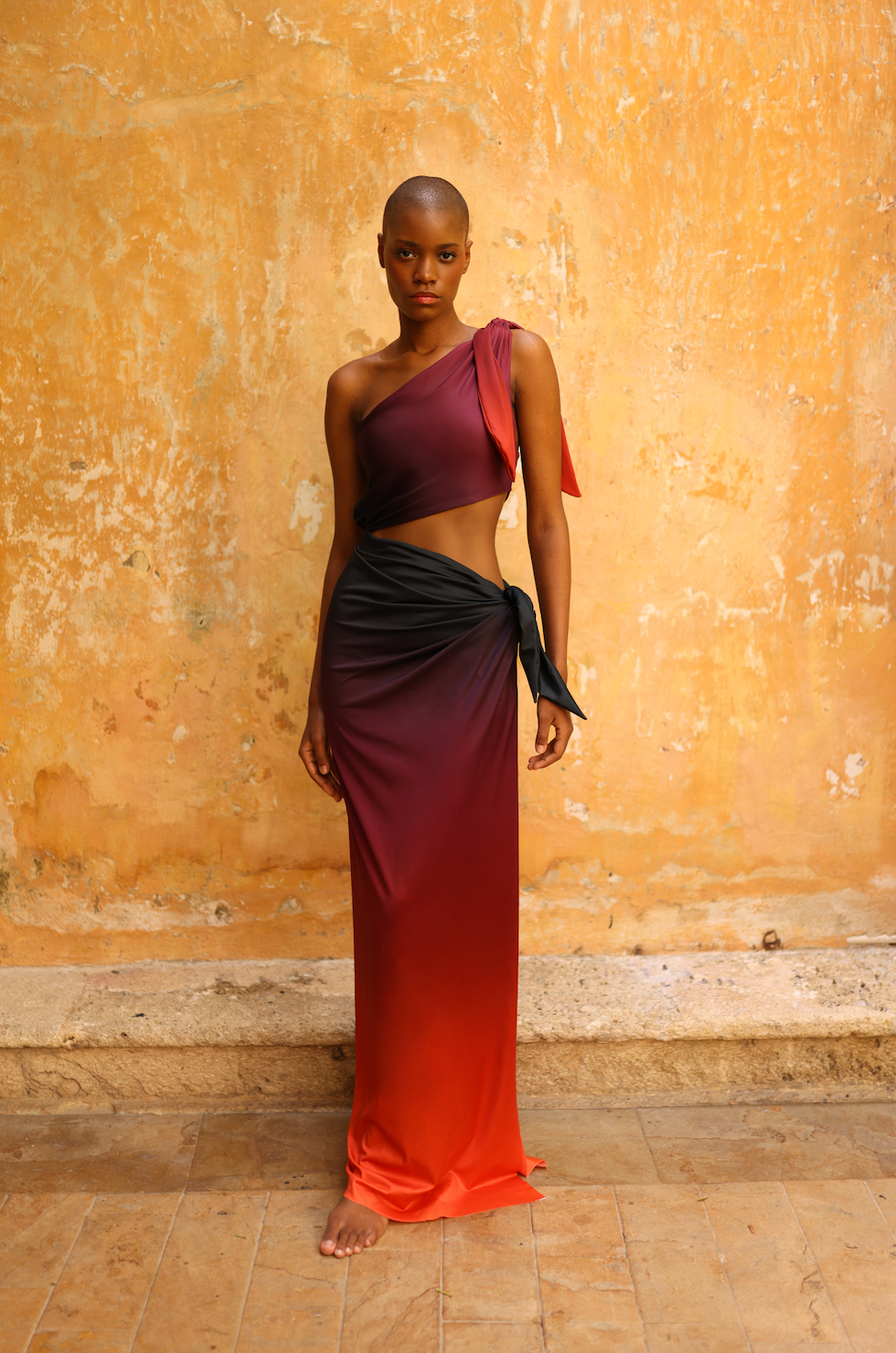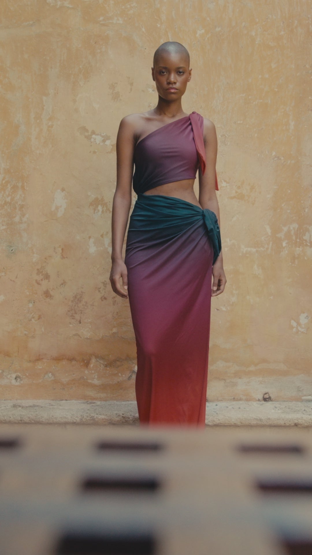 A striking one shoulder maxi dress designed in a seamless ombré that melts from deep burgundy into fiery coral. The asymmetrical silhouette features a sculpted top with a soft tie detail on the shoulder and a draped side knot that accentuates the waist. Its fluid, body-skimming fabric creates effortless movement.