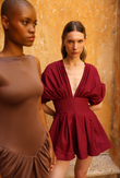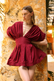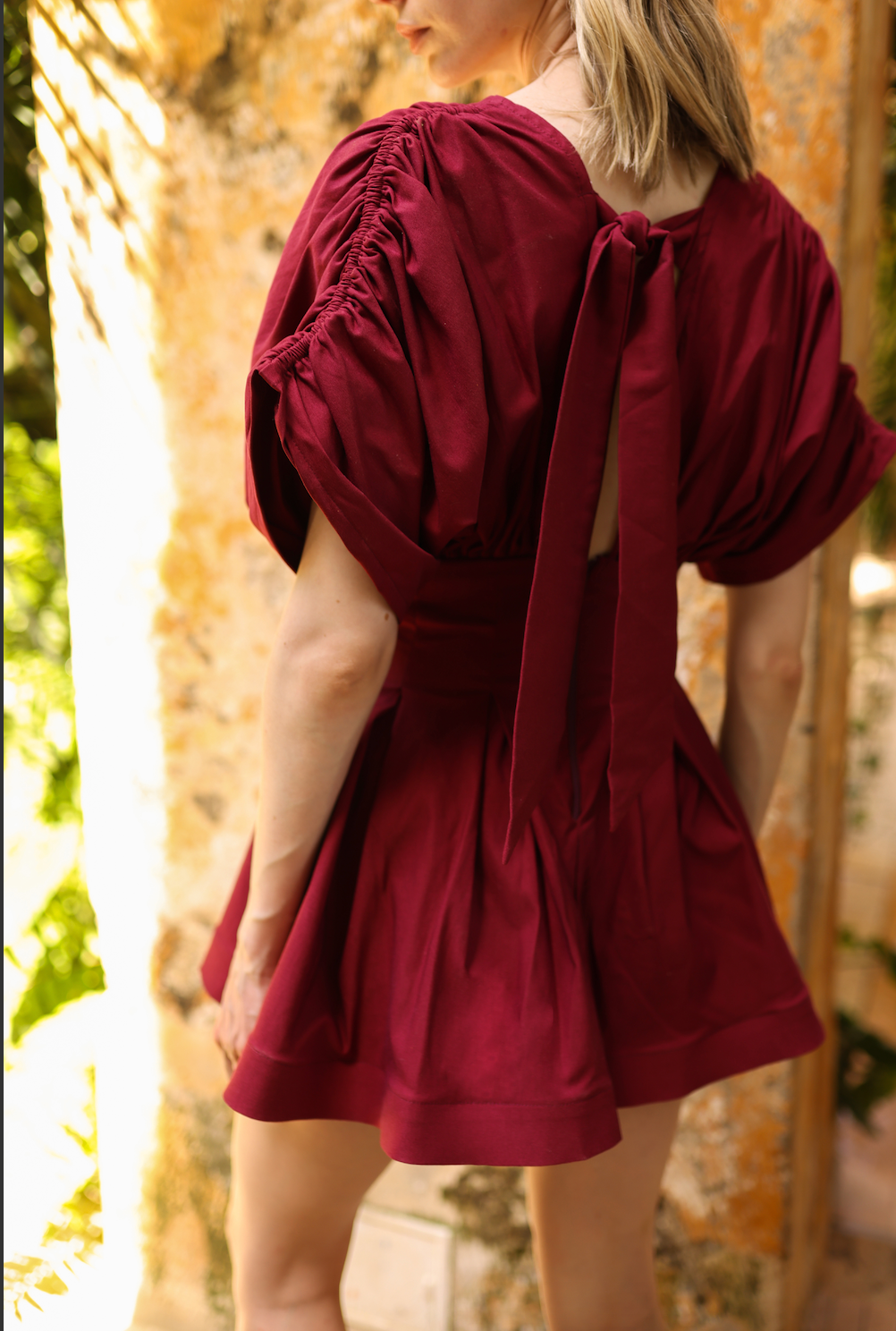 tomantic yet powerful mini dress designed to make a statement. Crafted in a rich wine hue, it features a deep V neckline, softly gathered sleeves, and a cinched waist that flatters the silhouette effortlessly. The open back with adjustable ties adds an unexpected touch of femininity, making it perfect for sunset dinners, celebrations, and special nights out.