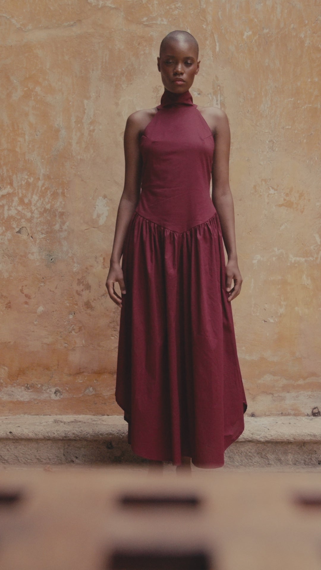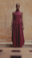 Sculpted halter neckline dress, an open back with delicate button detailing, and a voluminous gathered skirt, it blends sophistication with effortless movement. Crafted in a deep burgundy tone, it’s the perfect dress for evenings, celebrations, and elevated resort moments.