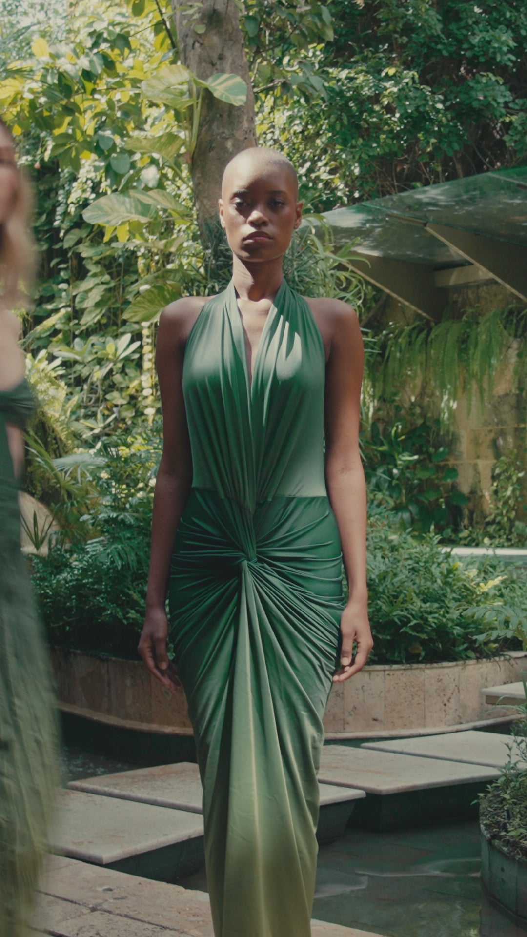 Draped halter gown with a deep plunge, front knot detail and a fluid body-skimming silhouette.