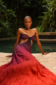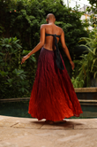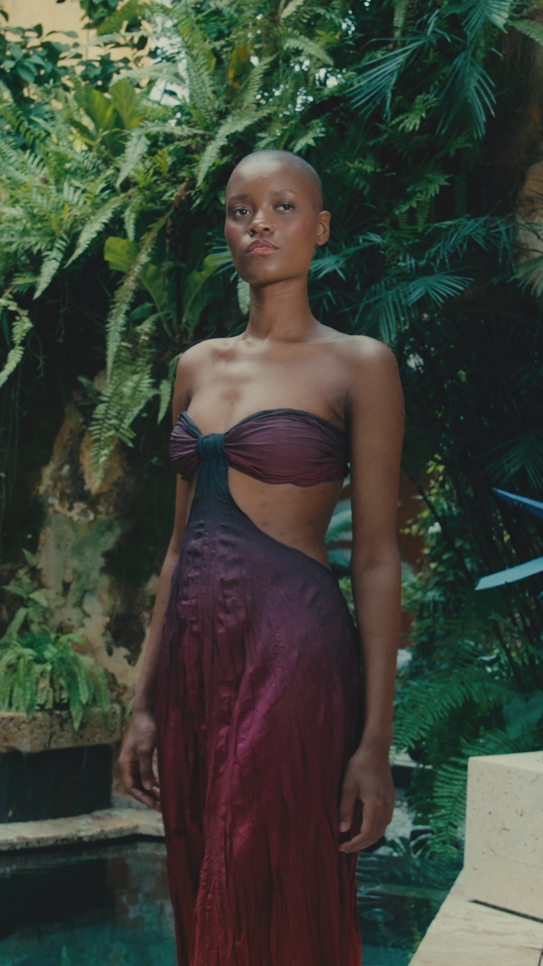 A flowing gradient dress with a knot-front bandeau top, side cutouts and a full pleated skirt that moves effortlessly with every step.