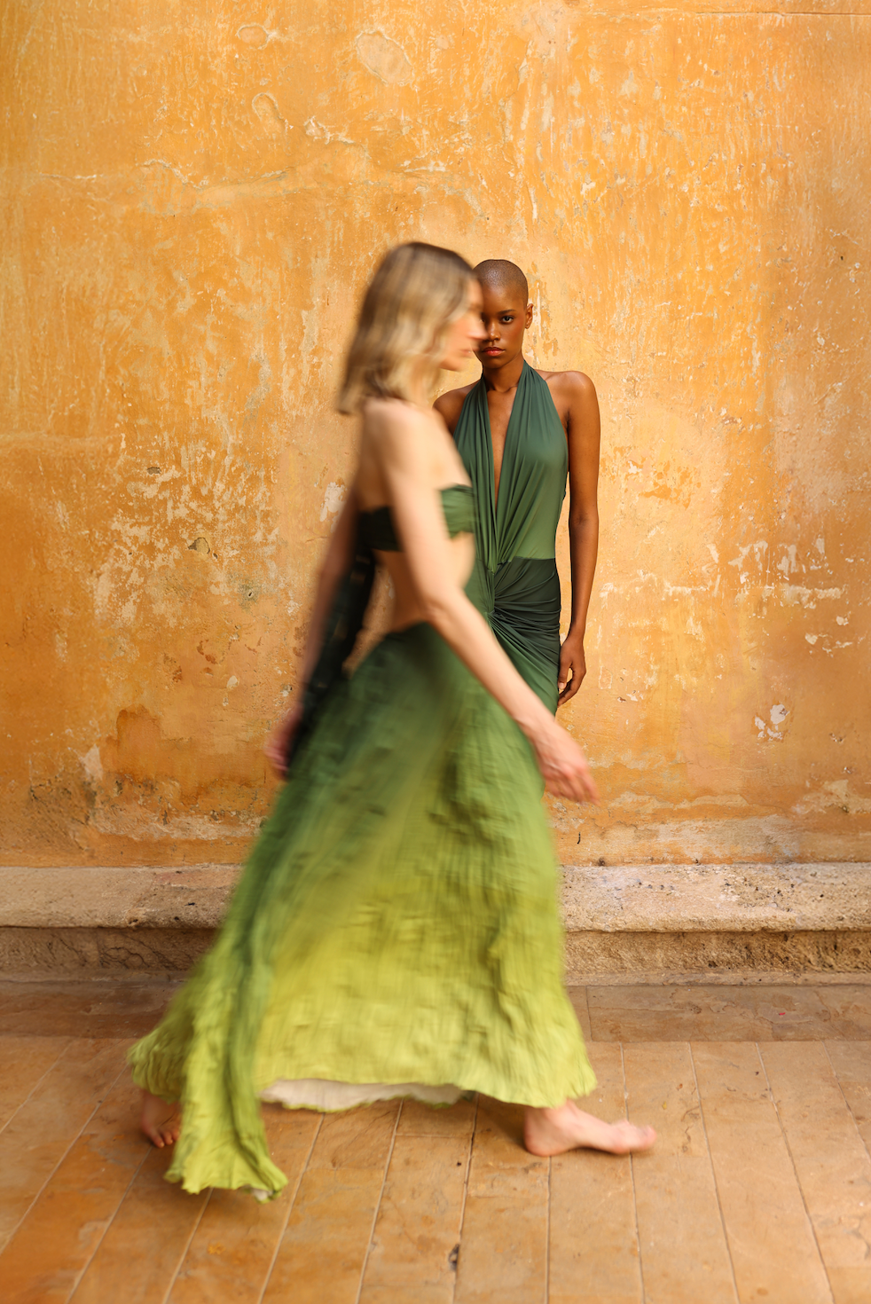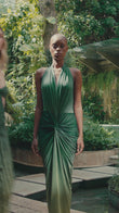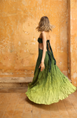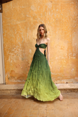 A flowing gradient dress with a knot-front bandeau top, side cutouts and a full pleated skirt that moves effortlessly with every step.